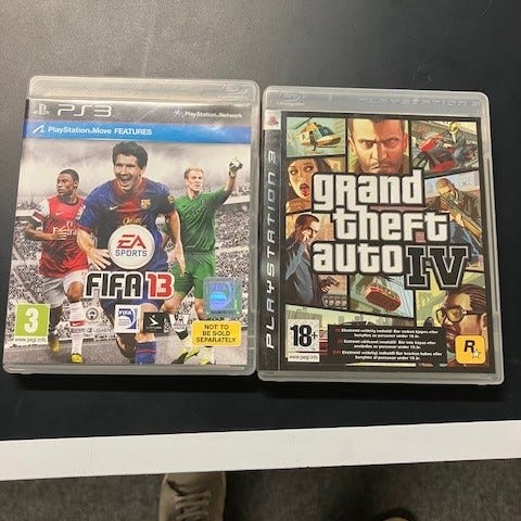 Sony Playstation 3 spelkonsol inklusive två handkontroller, rörelsekontroll och flera spel. Konsolen är svart och levereras med diverse spel för olika genrer.