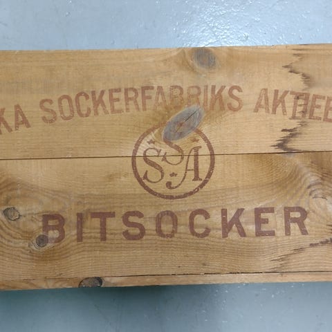 Svenska Sockerfabriks Aktiebolaget Bitsocker trälåda i trä. Lådan är märkt med företagsnamnet och används för förvaring av bitsocker.