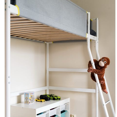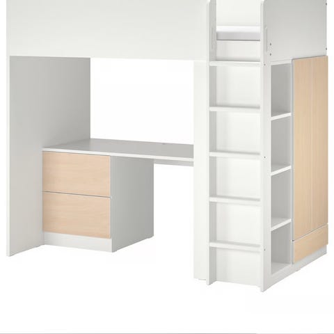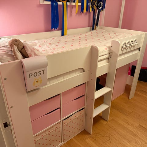Gedigen och smart loftsäng med inbyggt skrivbord och garderob under. Perfekt lösning för små barnrum där man vill frigöra golvyta och få mycket förvaring. Stadig och stabil konstruktion.