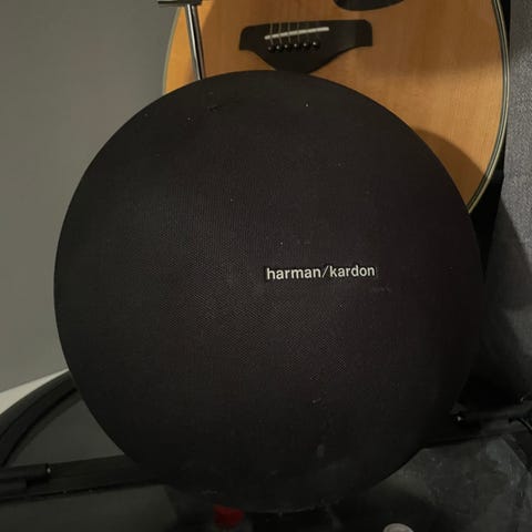 Harman Kardon högtalare i svart färg med rund design och metallstativ. Passar för ljuduppspelning i olika miljöer. Med nytt batteri