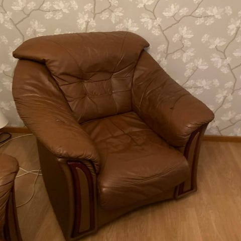 Skinnfåtölj köpt på Bromölla möbelaffär. Bra skick, har används minimalt.