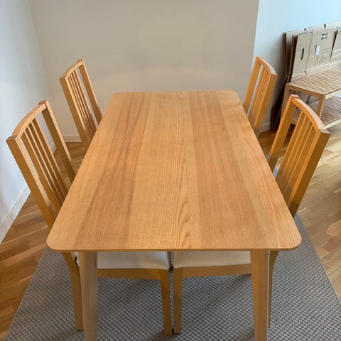Matbord i trä med två tillhörande Ikea stolar. Bordet har en fyrkantig form ca 73x73. Stolarna i nypris är 995kr för en stol.