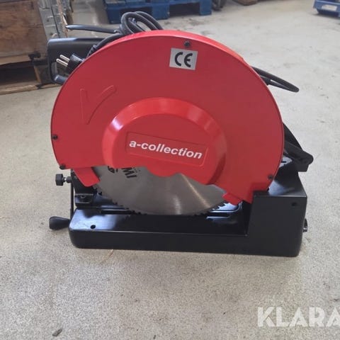 Har en metallkap för grova och precisa kapningar. Den kommer innan mig från en större metallverkstad. Robust konstruktion. Extra sågblad medföljer. Stödfötter finns med och ses i bilderna.
