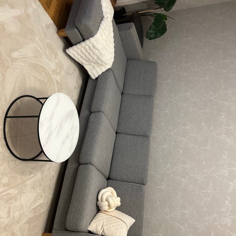 Bekväm och stabil, med fräscht tyg utan större fläckar eller skador. Har stått i rök- och djurfritt hem. Passar perfekt för större vardagsrum eller familj.