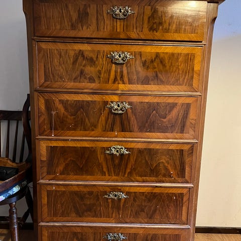 Står stadigt, dörrar och lådor fungerar som de ska. Normalt bruksslitage finns, men inget som påverkar funktion eller helhetsintryck. Detta är ett kvalitetsmöbel i trä, inte något lätt eller modernt plattpaket.