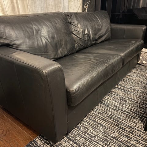 Svart lädersoffa med plats för tre personer. Soffan har en enkel och funktionell design med mjuka sitt- och ryggdynor i läder. Passar för vardagsrum eller loungeområden.