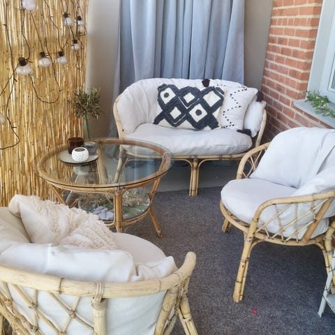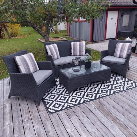 Utemöbelset bestående av en hörnsoffa och ett bord. Möbelsetet är tillverkat i grå rotting med gråa dynor. Soffan har en hörnform och kuddarna är stoppade och klädda i grått tyg. Bordet har en glasskiva ovanpå rottingunderlaget.