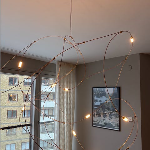 Dimbar. Ger olika intryck beroende på val av glödlampa och beroende på hur man väljer att organisera armarna som kan justeras på olika vis.