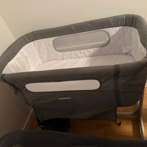 Moweo sängkantssäng med justerbar höjd och nätpanel för ventilation. Passar som en barnsäng som kan placeras intill föräldrasängen för enkel tillgång till barnet under natten.
