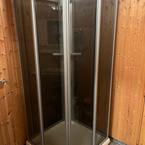 Duschkabin med svart ram i hörnmodell. Utrustad med tak- och handdusch samt massagemunstycken.