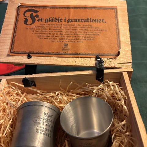 Set bestående av en rund tennflaska med dekorativt motiv föreställande en golfspelare och två matchande tennkoppar. Flaskan har skruvkork och kommer i en presentförpackning med blå insida och tillhörande tratt.