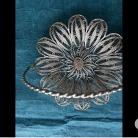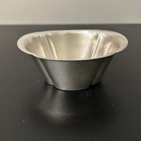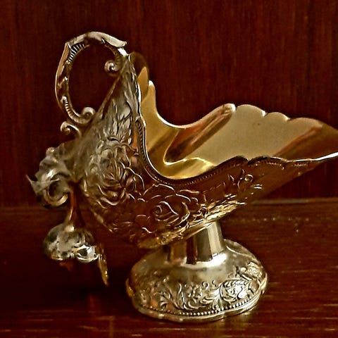 Säljer en dekorativ äldre sockerskål i metall med två handtag. Skålen är rikt dekorerad runtom med reliefmönster och står på fot. Ett klassiskt, ornamenterat uttryck som passar både som sockerskål, liten serveringsskål eller som dekorativ inredningsdetalj.