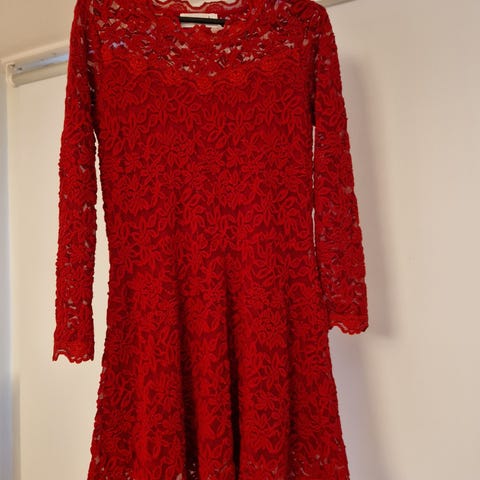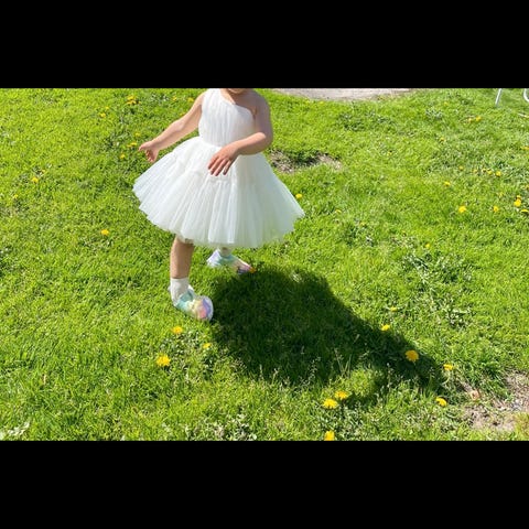 Märke: Little people klänning i vit färg, tillverkad i 100% polyester med tyllmaterial. Passar barn i storlek 146/ 11 år. Endast använd en gång. Klänningen har detaljer i spets och pärlor på överdelen samt tyllkjol med spetsapplikationer