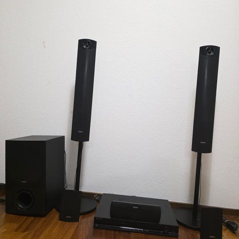 Sony hemmabiosystem med flera högtalare och subwoofer. Systemet inkluderar en huvudenhet med olika anslutningar för ljud- och videoingångar. Högtalarna är av olika storlekar och är designade för att användas i ett hemmabiosystem för att ge surroundljud. Dolby surround och inbyggd bluray.