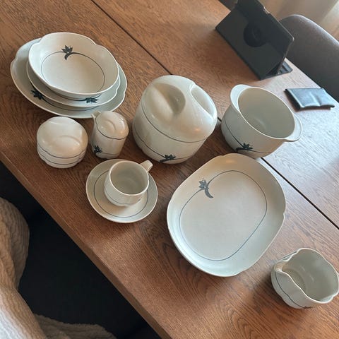 Rosenthal servisdelar i porslin med vit bas och dekor. Setet inkluderar tallrikar, koppar, skålar och serveringsfat. Passar för vardagligt bruk eller till festliga tillfällen.