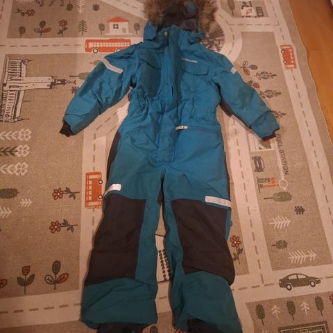 Ovarellen är från Didriksons. Den har använts av ett barn. Den har ett litet hål på vänster knä och ett karbdborde-band på högra benet har lossnat. Utöver detta finns inga andra defekter. Rök- och djur-fritt hem.