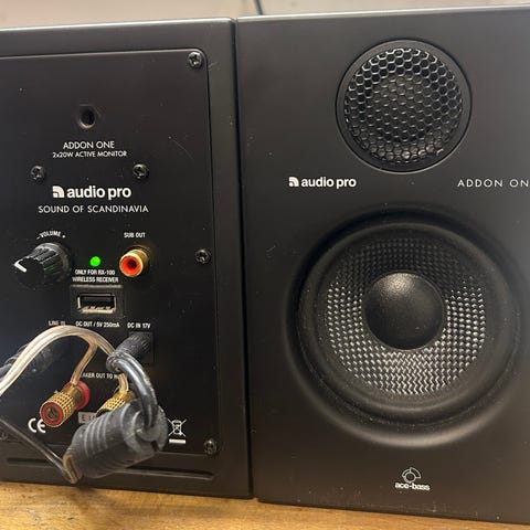 Säljer ett par aktiva högtalare av märket audio pro. Dom spelar fantastiskt bra och är som sagt i nyskick. Bara att koppla in och njuta.