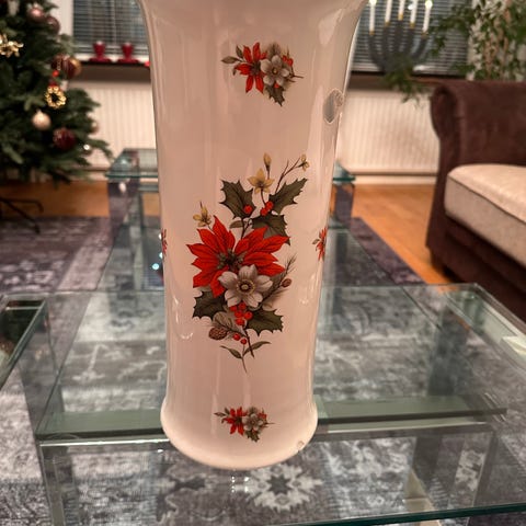 Gustavsberg 255-Z vas i keramik med färgglatt motiv föreställande människor och häst. Vasens yta är vit med detaljer i flera färger och den har en cylindrisk form. Passar som dekorativ inredningsdetalj.