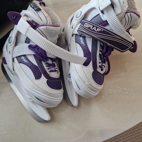 Graf barnskridskor i storlek 30 med vit och lila färg. Skridskorna är avsedda för barn och tillverkade med justerbara storlekar mellan storlek 27 - 30.