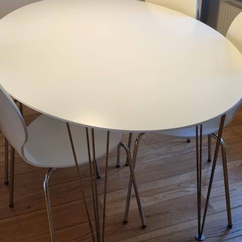 Slät vit skiva med en lättskött lackerad yta. Benen är i metall. Stol med skålad rygg och sits. Klädd i slitstarkt möbeltyg. Benen är i lackerad metall.