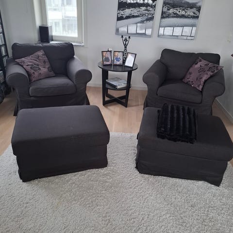 Mörkblå fåtölj med matchande fotpall. Fåtöljen har en bred och vadderad sittdyna samt mjuka armstöd. Träben. Nypris ca 30 000 kr. Måtten som anges är fåtöljens mått, pallen är b80, h43 d60.