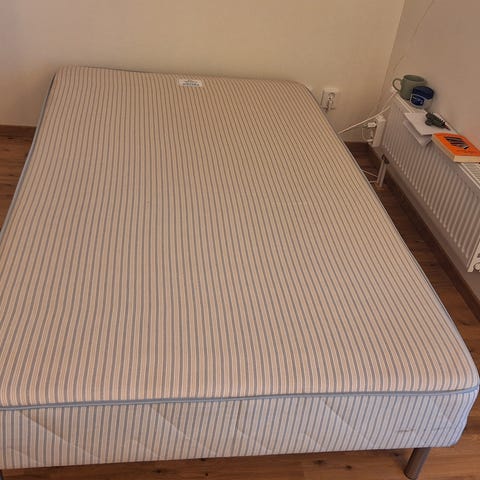 Säng med bäddmadrass. 200x120cm. Höjd utan bäddmadrass 40cm. Sängbotten ca 22cm tjock. Bäddmadrass ca 4cm. Aluminiumben som går att skruva bort. Ca 10-15 år gammal. Tillverkare okänt.