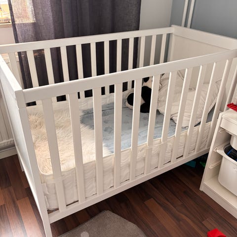 IKEA spjälsäng i vitt trä. Passar för små barn och är utformad för att ge en säker sovplats.