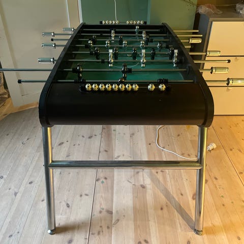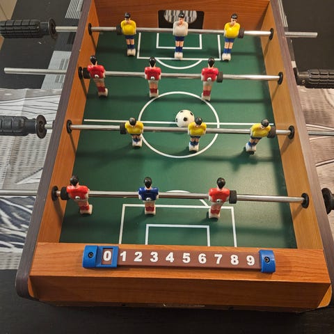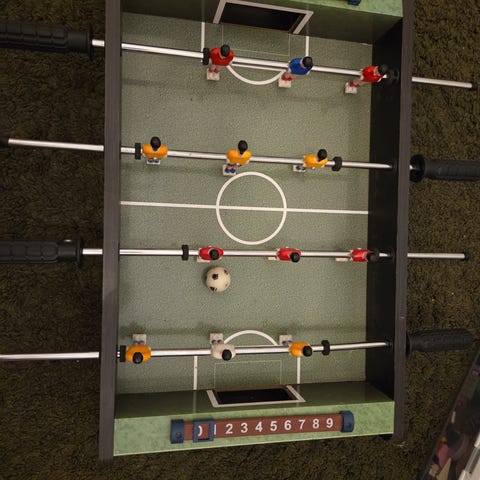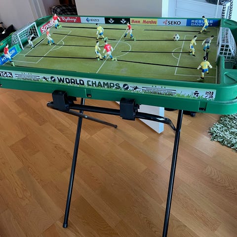 Garlando bordfotbollsspel med spelare i rött och vitt, utrustad med handtag för spelkontroll och målportar. Passar för inomhusbruk och sociala spelaktiviteter.