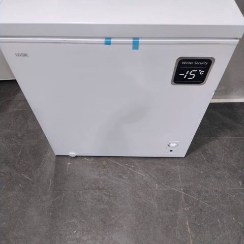Whirlpool frysbox med vit färg och manuell kontrollpanel. Utrustad med en inre korg för organisering av frysta varor.