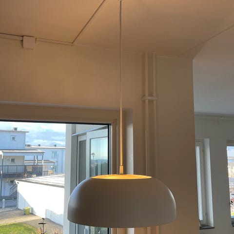 Taklampa i grå plåt från Strömshaga. Lampskärmens diameter är 50 cm.