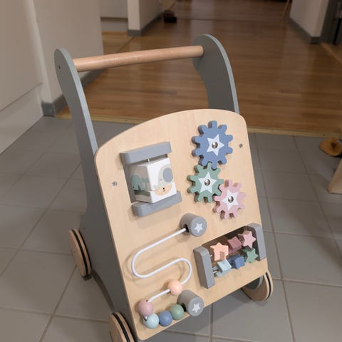 Gåvagn/aktivitetsvagn är en rolig leksak som hjälper ditt barn att ta sig fram på egen hand. Den är också rolig att leka med då den har en massa roliga aktiviteter på framsidan. Vagnen är kombinerad med roliga aktivitetsleksaker för att barnet ska utveckla sina sinnen och motorik. Det finns en liten kulram som barnet kan snurra på och dra kulor fram och tillbaks. En fyrkantig kloss med olika djurmotiv på alla sidor så barnet själv kan mixa ihop roliga figurer.