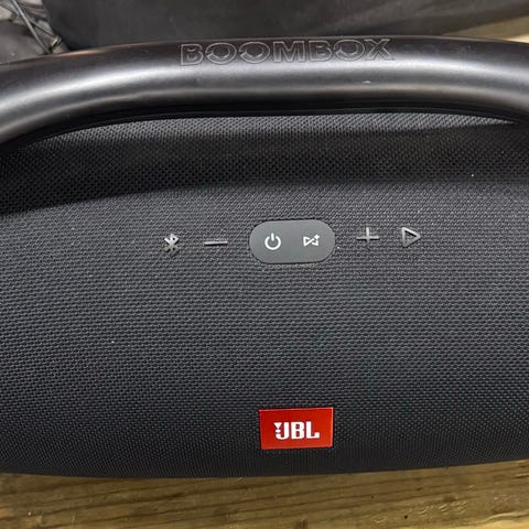 Kraftfull JBL Boombox bärbar Bluetooth-högtalare med ikonisk design och robust handtag. Spelar högt och klart, perfekt för både inomhus och utomhus.