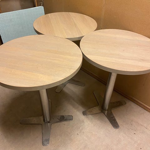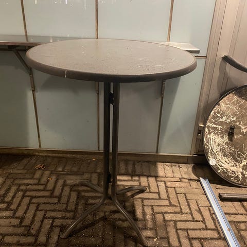 Runt plåtbord med avtagbar bricka på hopfällbart stativ.