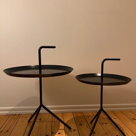Metallbord med rund bricka och benställning. Bordet är tillverkat i metall och har en rund bricka som kan användas för servering eller som avlastningsyta. Benställningen ger stabilitet och bordet är lätt att flytta tack vare handtagen på brickan.