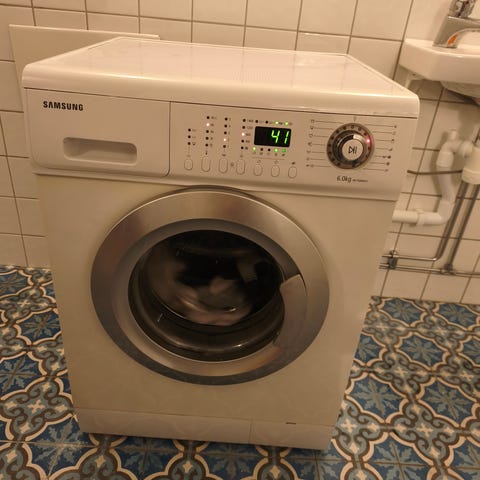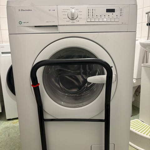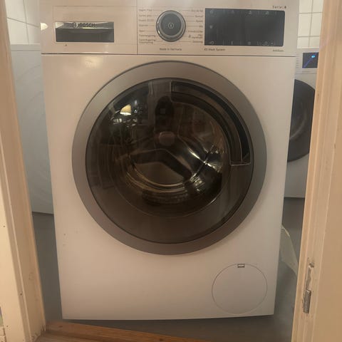 Bosch frontmatad tvättmaskin med svart färg. Maskinen har en stor trumma och en digital display för programval och inställningar. Dörren är frontmonterad och maskinen är avsedd för hushållstvätt. Handtaget har gått sönder men går att öppna utan handtag och funkar
