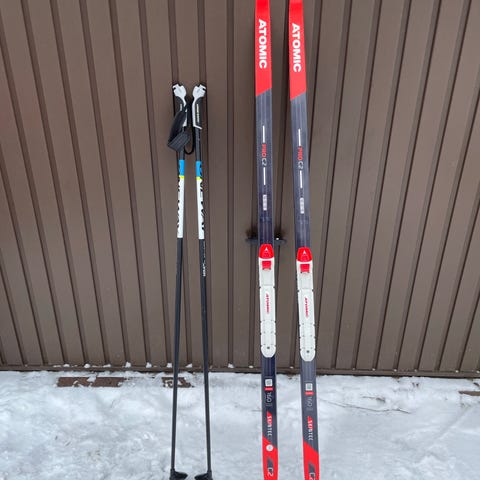 Längdskidor Karhu och Peltonen kompletta med Salomonbindningar samt stavar Exel