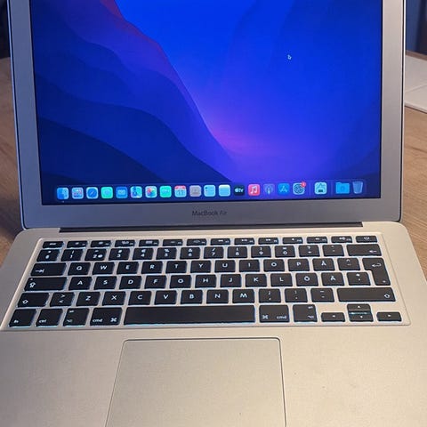 Apple MacBook Air 13 tum bärbar dator i silver. Utrustad med macOS Monterey, Intel Dual-Core i5 processor, 8 GB RAM och 512 GB SSD-lagring. Inkluderar laddare och nätadapter.