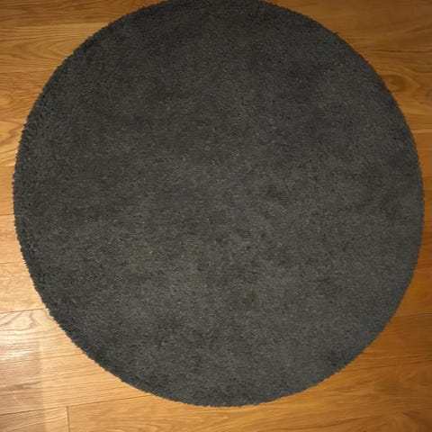 IKEA STOENSE rund matta med måtten 195x195 cm i beige färg. Mattan är tillverkad av syntetmaterial och har en mjuk yta. En del av mattan har legat under en säng.