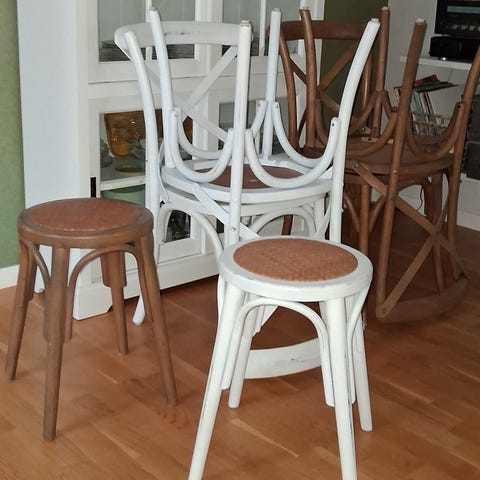 6 st Östervålastolar i använt men fint skick. Rottingen på samtliga stolar är hel. Finns några skavanker i form av färgskav. På en av stolarna har en liten del av möbelbandet släppt, se bild.