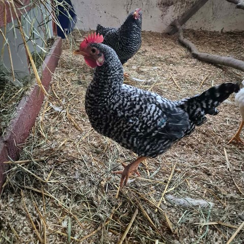 - 1 Spättad Orpington tupp (blå med mörka prickar).