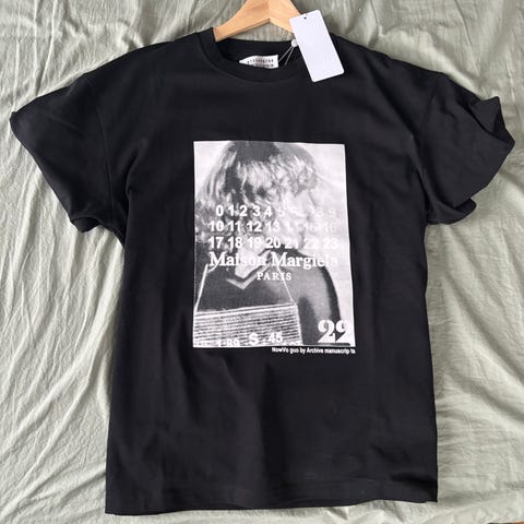 Maison Margiela T-shirt i svart färg, tillverkad av bomull. Storlek L för herr. T-shirten har tryckdetaljer fram och bak.
