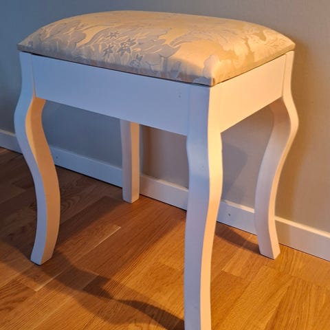 2. Säljer en charmig liten pall klädd i ett mjukt, rosa tyg med fin lyster. Pallen har eleganta, svängda kabriolben i svart.