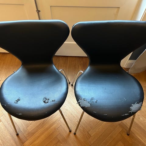Två stolar från Fritz Hansen, designade av Arne Jacobsen. Stolarna är klädda i läder och var en limiterad specialutgåva.