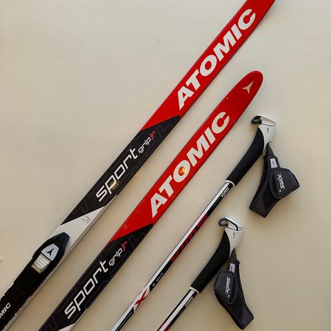 Längdskidor + Stavar Barn/Ungdom, 160cm. Pjäxor strl 38
