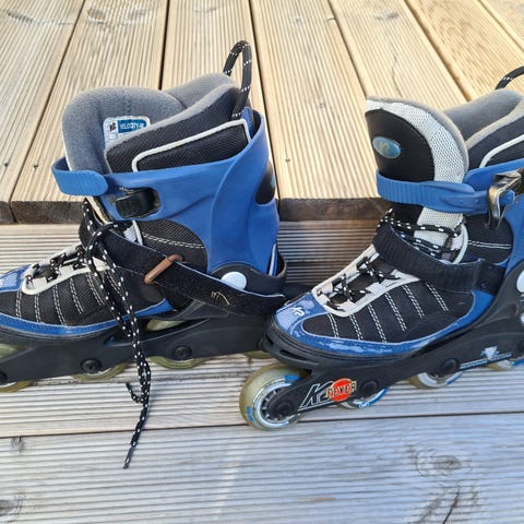 Skorna är blå och orange och avsedda för rullskridskoåkning och inlines. Material och övriga detaljer framgår av bilder.