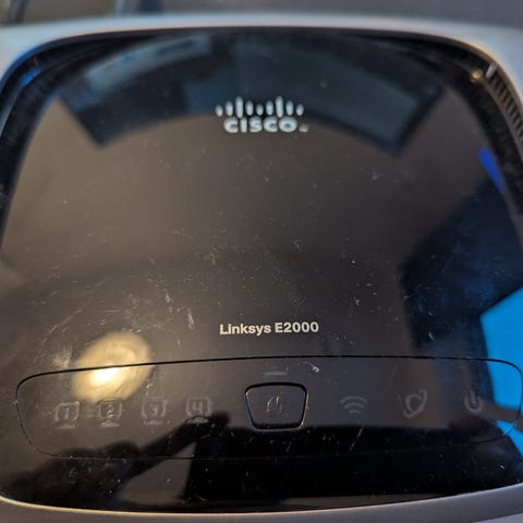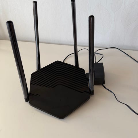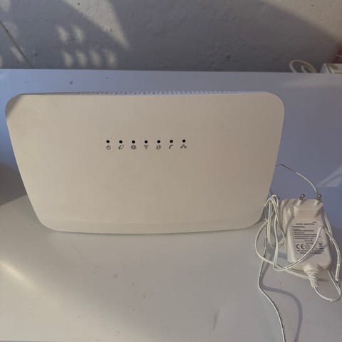 Sagemcom F@ST 5350e AC router med nätverksanslutningar inklusive flera Ethernet-portar. Enheten är svart och levereras med strömadapter och nätverkskabel. Används för trådbunden och trådlös internetanslutning.