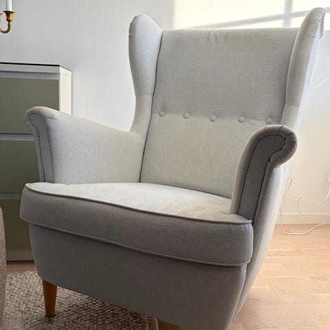 Grå Strandmon fåtölj med fotpall den stora modellen. I behov av rengöring, torkas av eller med en ångdammsugare. Det finns något ben på både pallen och fåtöljen som blivit sena. Varit så i något år och inget som stör funktionen, går säkert skruva bort och böja till.
