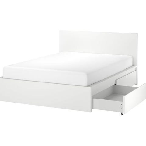 IKEA Malm sängstomme i vitt med integrerade förvaringslådor.
