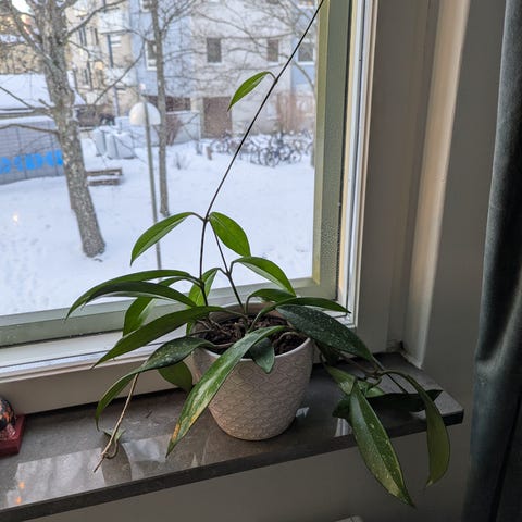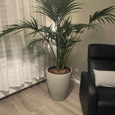 Grön inomhusväxt placerad i en mörk grå kruka.