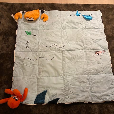 IKEA KULPPA lekmatta med olika färgglada figurer i hörnen. Tillverkad av textilmaterial. Passar för barnlek och som mjuk underlag på golvet.